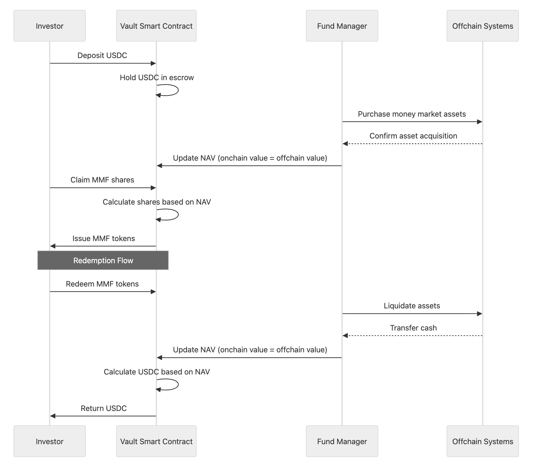 For example, let’s look at a tokenized money market fund (MMF). The fund manager wants to accept dollar-backed stablecoins (USDC) and issue MMF tokens to their investors to represent their ownership in the fund. The investor must deposit the stablecoin into the issuer’s smart contract. The manager may update the NAV so that the onchain value accurately matches the offchain before the investor can claim their MMF shares. All of this logic can be implemented at the vault level, as is the case with Ethereum and ERC4626 and ERC7540.
